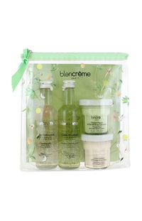 Cette trousse contient : - Une gelée micellaire - Thé vert & concombre - 75 ml- Une gelée nettoyante - Blé & orge - 75 ml- Un sorbet visage - Orange & citron - 40 ml- Un masque visage - Thé vert & concombre - 40 ml