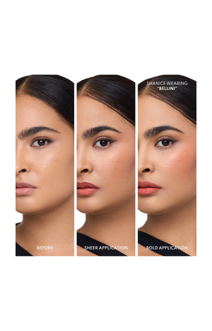Prélever une petite quantité à l’aide des doigts ou d’un pinceau et tapoter sur les pommettes. Estomper pour un effet diffus ou intensifier pour un fini plus marqué.