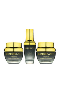 Masque : Purified Water, Glycerin, South Sea Pearl, Sunflower Oil, Caprylic/Capric Triglyceride, Gold, Stearate Acid, Cetyl Alcohol Sweet Almond Oil, DMAE, Aluminium Magnesium Silicate, Green Tea Extract, DMAE, Aloe Barbadensis Leaf Juice, Glow, Cumumis Starivus ( Cucumber Extract),Mentol Tocopherol Acetate, Tea, Phenoxyl Elhnol, Colyly Glycol, Calla Lillie’s.Sérum : Water(Aqua), Collagen, Glycerin, Macrocystis Pyrifera(Kelp)Extract (Organic), Propylene Glycol, Algae, DMAE, Acetyl Hexapeptide-3, Sodium Hyaluronate, Allantoin, Tocophery Acetate, Retinyl Palmitate, Ascorbic Acid(Vitamin C), 24K Gold, Aloe Barbadensis(Aloe Vera)Leaf Juice (Organic), Chamomilla Recutita(Chamomile)Flower Extract (Organic), Carbomer, Triethanolamine, Ethylhexylglycerin, PhenoxyethanolCrème de jour : Water(Aqua), Collagen, Glycerin, Macrocystis Pyrifera(Kelp)Extract (Organic), Propylene Glycol, Algae, DMAE, Acetyl H