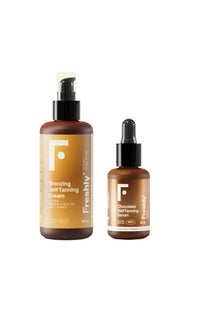 Un duo bronzant complet : un sérum autobronzant pour le visage et une crème autobronzante pour le corps, formulés à plus de 99 % naturels. Le sérum visage intensifie et maintient le hâle tout en respectant la peau des peaux sensibles. La crème corps est idéale pour gagner un teint doré sans soleil. Résultat : un bronzage progressif, uniforme, confortable et sans traces.