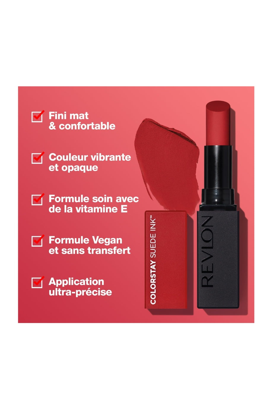 On aime- Sa formule longue tenue qui tient toute la journée- Sa texture douce et confortable sur les lèvres- Sa couleur intense et vibrante pour un look audacieux- Sa formule enrichie en vitamine E pour des lèvres nourries
