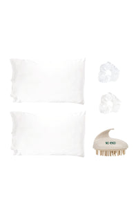 Craquez pour cet ensemble de nuit conçu pour sublimer vos routines de beauté et garantir des réveils en douceur ! La taie d'oreiller en satin de haute qualité, accompagnée d’un chouchou satiné, offre une texture lisse qui prend soin de vos cheveux et de votre peau. Contrairement aux taies en coton classiques, elle limite les frictions, réduisant ainsi les frisottis et maintenant l’hydratation de la peau. On adore !Ce kit contient : - 2 taies d'oreiller en satin blanc (environ 50 cm x 75 cm)- 2 chouchous satiné blanc- Une brosse massante pour le cuir chevelu
