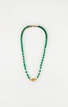 Ce collier élégant associe la profondeur vibrante de la malachite à des détails dorés texturés pour une allure audacieuse et précieuse. Le bijou se distingue par ses perles vert intense et son élément central doré martelé, qui attire la lumière avec subtilité. Un indispensable pour rehausser un décolleté ou un col de chemise avec caractère.